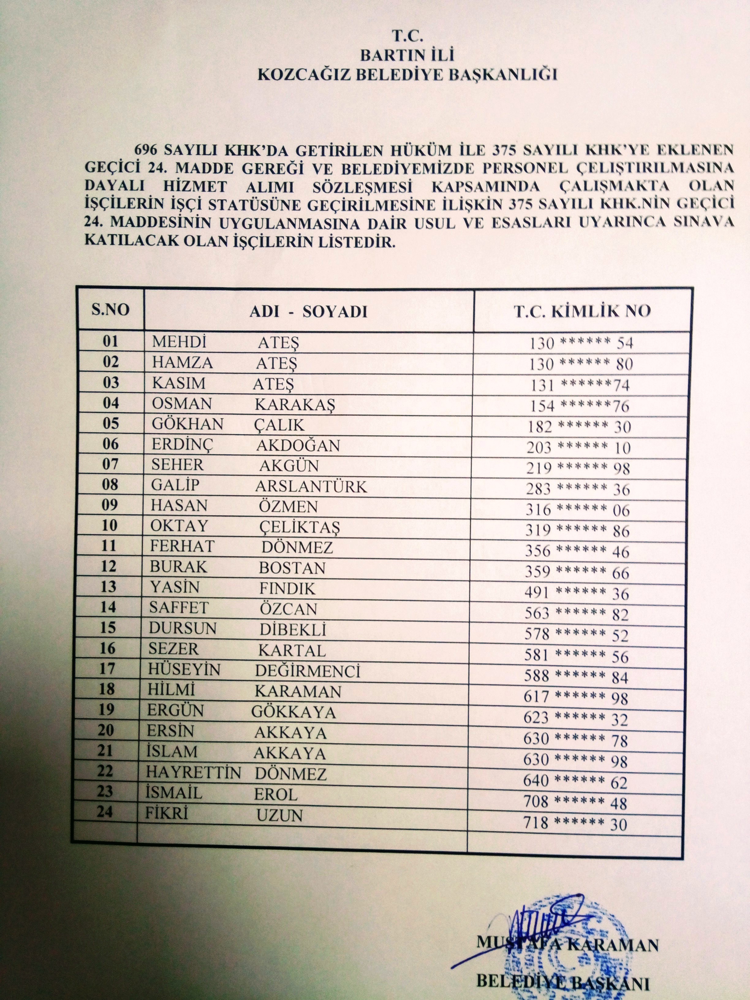 24.12.2017 Tarihli Resmi Gazetede Yayımlanan 696 sayılı Kanun Hükmünde Kararnamenin 127’nci maddesi (375 sayılı KHK’ya eklenen geçici 24’ncü madde) ve 01.01. 2018 tarihinde yayımlanan bu Kanun hakkındaki uygulamaya dair usul ve esaslar gereğince Belediye Başkanlığımıza başvuruda bulunan alt işveren çalışanlarımızın başvuru sonuçları ek’li listelerde yer almaktadır.