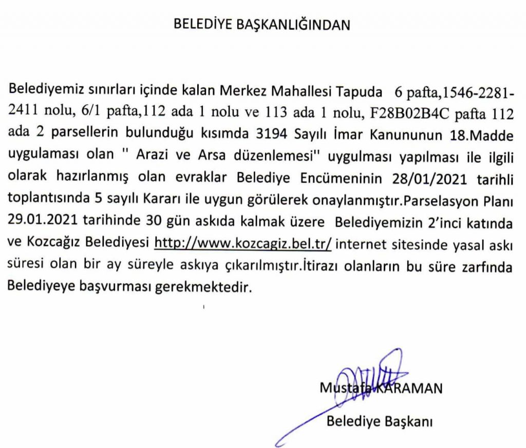 « Beldemiz içerisinde ‘’Karayolu Geçişi,Gençlik Merkezi,Teknik Altyapı Alanı ve Konut Alanları